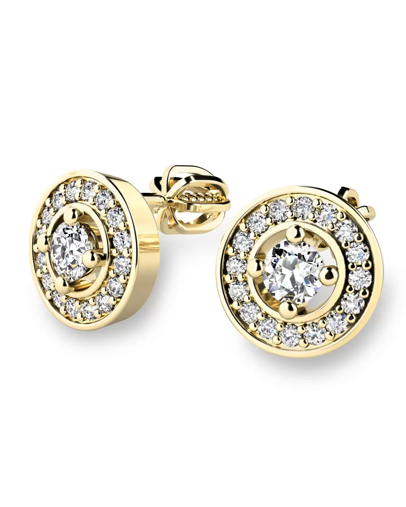 Nádherné luxusní dámské náušnice pecky osázené diamanty budou ideálním dárkem pro každou ženu. Náušnice jsou vyrobeny ze žlutého čtrnáctikarátového zlata - 585/1000 v lesklé povrchové úpravě. Vsazené diamanty jsou vybroušeny dokonalým briliantovým brusem, díky kterému dokonale odráží světlo a jejich brilance neuvěřitelné září z každého úhlu pohledu! Všechny diamanty jsou pevně uchyceny krapnami. Vsazování diamantů provádějí naši nejzkušenější mistři zlatníci ručně pod mikroskopem s přesností na 0,01mm a proto nehrozí vypadnutí kamínků jako to bývá u strojně vyráběných náušnic. Celé náušnice působí dokonalým a luxusním dojmem! Náušnice se zapínají na šroubek. Šroubek pro balónek je umístěný cca 2 mm pod horní okraj náušnice a tedy krásně zakrývá dírku v uchu.