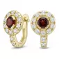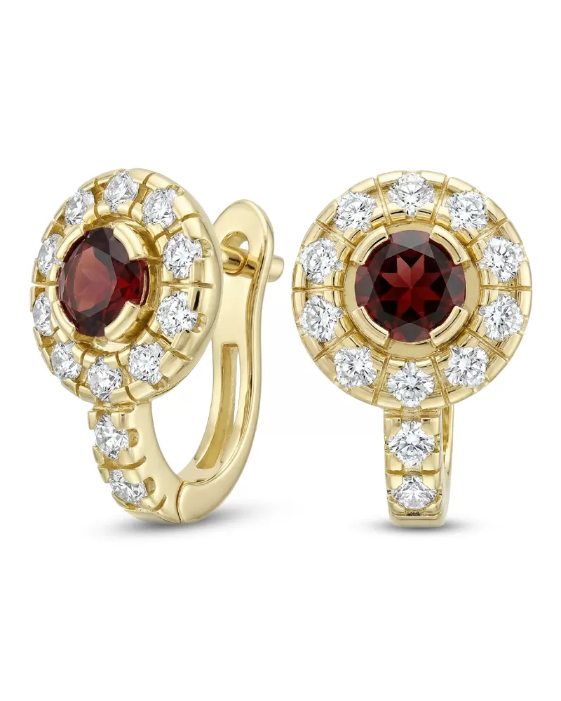 Náušnice typu "podkovičky" patří mezi velmi oblíbené typy náušnic, náušnice jsou vhodné pro každodenní nošení i na společenské akce a sluší každé ženě! Jsou vyrobeny ze žlutého čtrnáctikarátového zlata - 585/1000 v lesklé povrchové úpravě. V náušnicích je vsazeno "do krapniček" dvacetčtyři menších diamantů a dva větší centrální granáty. Všechny kameny jsou vybroušeny kulatým briliantovým brusem, který zajišťuje maximální brilanci vybroušených facet a krásně září ze všech úhlů pohledu! Vsazování diamantů a drahokamů provádějí naši nejzkušenější mistři zlatníci ručně pod mikroskopem s přesností na 0,01mm a proto nehrozí vypadnutí diamantů jako to bývá u strojně vyráběných šperků. Náušnice jsou středně velké, na uchu vypadají elegantně a přirozeně a díky skladbě a stylově čistému vsazení diamantů vynikají krásnou brilancí kamenů!