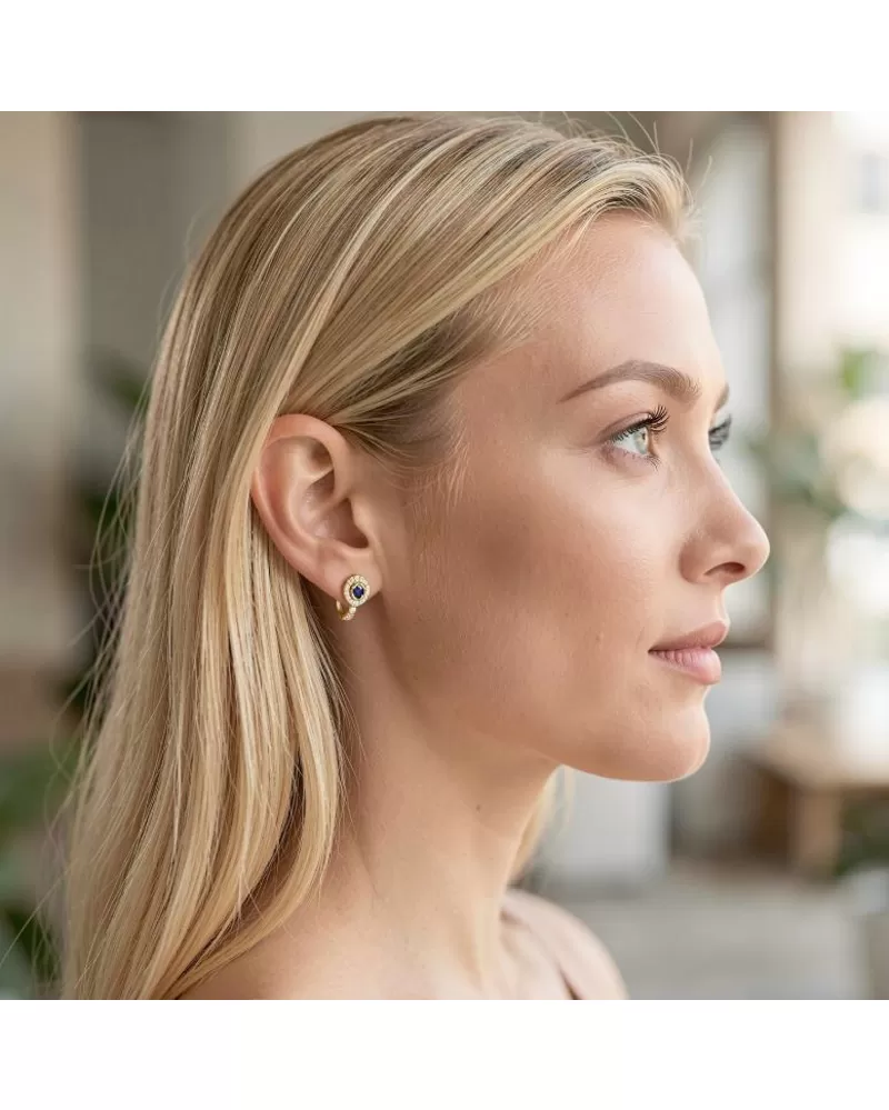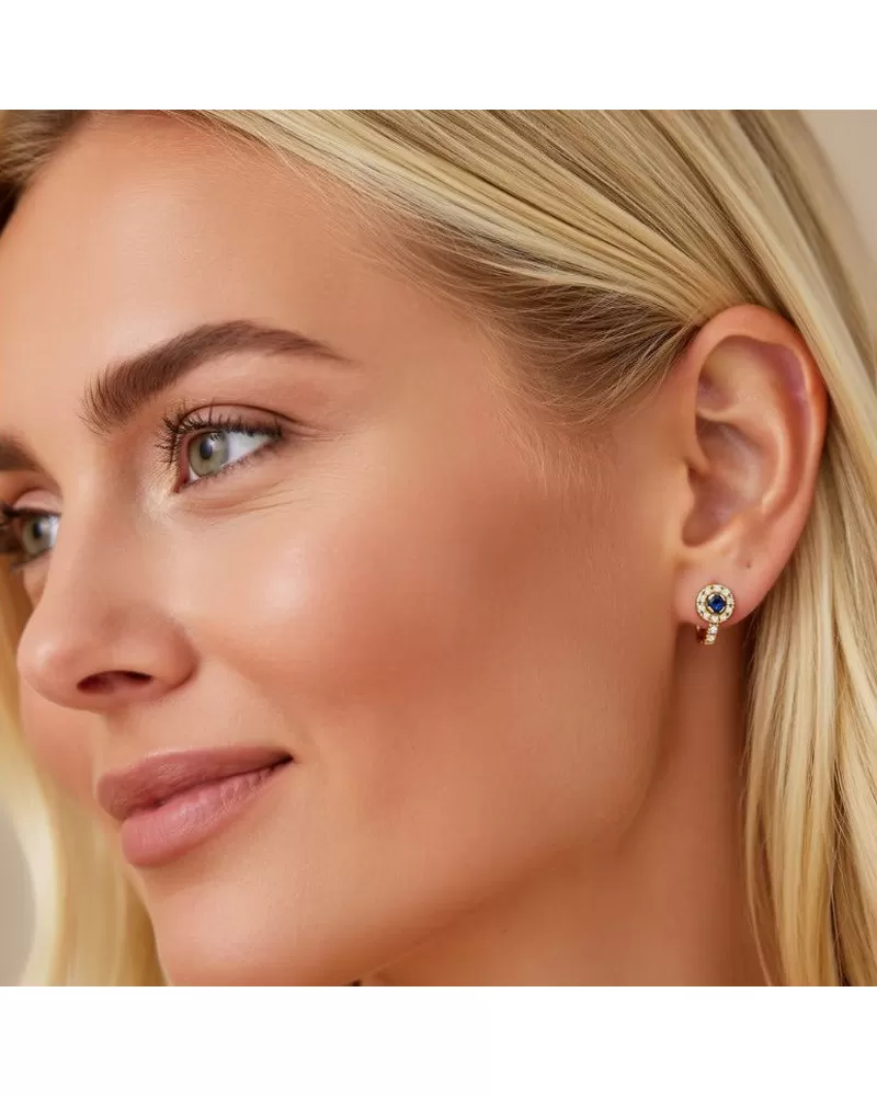 Náušnice typu "podkovičky" patří mezi velmi oblíbené typy náušnic, náušnice jsou vhodné pro každodenní nošení i na společenské akce a sluší každé ženě! Jsou vyrobeny ze žlutého čtrnáctikarátového zlata - 585/1000 v lesklé povrchové úpravě. V náušnicích je vsazeno "do krapniček" dvacetčtyři menších diamantů a dva větší centrální safíry. Všechny kameny jsou vybroušeny kulatým briliantovým brusem, který zajišťuje maximální brilanci vybroušených facet a krásně září ze všech úhlů pohledu! Vsazování diamantů a drahokamů provádějí naši nejzkušenější mistři zlatníci ručně pod mikroskopem s přesností na 0,01mm a proto nehrozí vypadnutí diamantů jako to bývá u strojně vyráběných šperků. Náušnice jsou středně velké, na uchu vypadají elegantně a přirozeně a díky skladbě a stylově čistému vsazení diamantů vynikají krásnou brilancí kamenů!