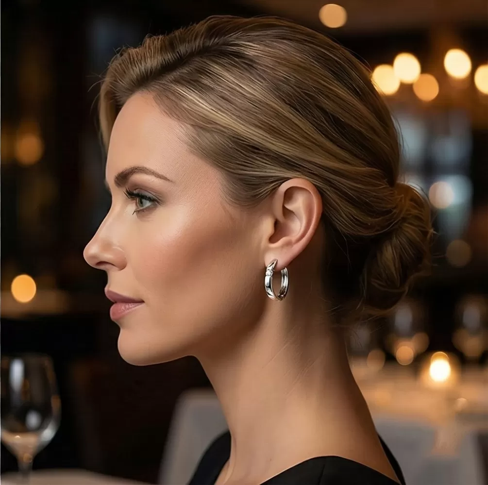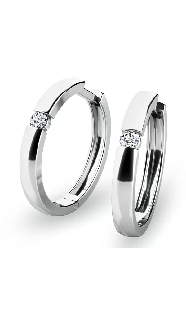 Náušnice kruhy patří mezi vůbec nejoblíbenější typ náušnic, náušnice jsou vhodné pro každodenní nošení i na společenské akce a sluší každé ženě! Tyto elegantní kruhy jsou vyrobeny z bílého čtrnáctikarátového zlata - 585/1000 v lesklé povrchové úpravě a s mírně půlkulatou horní plochou. V náušnicích jsou vsazeny dva kulaté diamanty v briliantovém brusu, díky kterému dokonale odráží světlo a neuvěřitelné září.