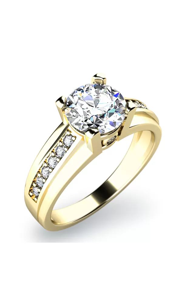 Oslňující zásnubní prsten je vyroben ze čtrnáctikarátového zlata - 585/1000 v lesklé povrchové úpravě. Prsten má jeden hlavní diamant briliantového brusu, který je uchycený do čtyřkrapnové korunky. Toto uchycení pomůže diamantu dokonale vyniknout jeho kráse a brusu. Po stranách v obroučce prstenu je vsazeno 12 zářivých diamantů, které prsten zjemňují. Zásnubní prsten ohromí z každé strany. I na bocích je vsazen diamant a dotváří tak prsten k dokonalosti.