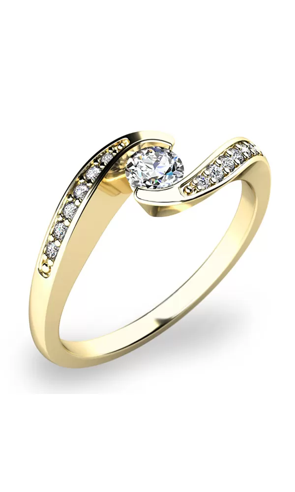 Elegantní zásnubní prsten je vyroben ze žlutého čtrnáctikarátového zlata - 585/1000 v lesklé povrchové úpravě. Prsten má mírně zakroucené linie, které se spojují ve středu a lemují středový větší zirkon. Obroučka je v horní části osázena dalšími menšími zirkony. Všechny zirkony mají briliantový brus Signity star, který zajišťuje maximální brilanci kamenů. Díky skladbě a stylově čistému vsazení zirkonů, prsten vyniká krásnou brilancí kamenů. Vsazování zirkonů do zásnubních prstenů provádějí naši nejzkušenější mistři zlatníci ručně pod mikroskopem s přesností na 0,01mm a proto nehrozí vypadnutí kamínků jako to bývá u strojně vyráběných zásnubních prstenů. Tento tvar prstenu je velice oblíbený svým atypickým a moderním vzhledem.