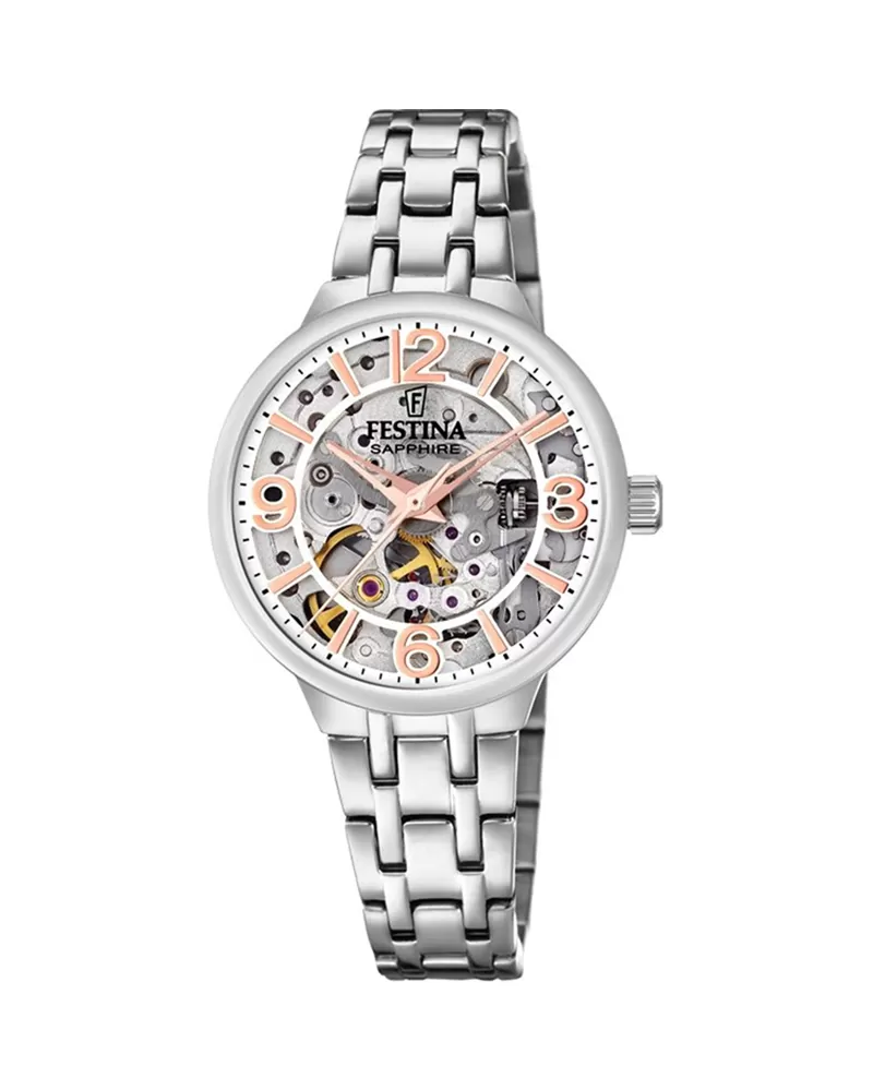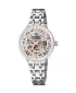 Dámské analogové hodinky s automatickým strojkem vás upoutají na první pohled. Dokonalé provedení kulatého pouzdra dá nahlédnout na pohybující se strojek, který chrání ocelové pouzdro a minerální sklo. Indexy a ručičky jsou v barvě růžového zlata, které dokonale hodinky zvýrazňují. Dopřejte si luxus a pohodlí dámských automatických hodinek. Už nebudete chtít jiné.