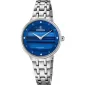 Elegantní dámské hodinky s vodotěsností 5 ATM na ocelovém tahu. Modrý číselník je ozdobený ručičkami v barvě pouzdra a čtyřmi zirkony na pozicích 3, 6 ,9 a 12 hodin.