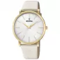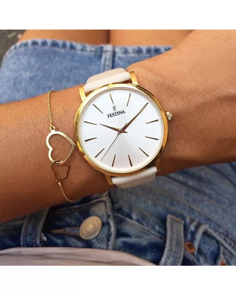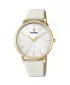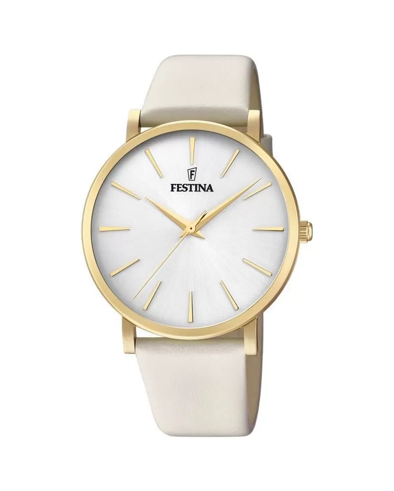 Toužíte po elegantních hodinkách, které zaujmou vaše okolí a ve kterých se budete cítit příjemně i po celodenním nošení? Tyto krásné hodinky značky Festina jsou vyrobené v kombinaci ocelového pouzdra a koženého řemínku béžové barvy. Kůže vám nebude tížit ruku a bude pohodlným řemínkem na celý den. Hodinky jsou laděné do světlých barev s pozlaceným pouzdrem. Vodotěsnost tohoto modelu se vztahuje pouze na lehký déšť nebo mytí rukou.