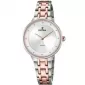 Elegantní model dámských hodinek je vyroben z chirurgické ocele, která je místy zlacená technologií PVD v barvě růžového zlata. Předností zlacení technologií PVD je vysoká tvrdost a odolnost proti otěru! Jedná se o silnou vrstvu, která proniká do původního materiálu. Zlacení technologií PVD se dá srovnat s přibližně 12 mikrony galvanického zlacení, což je vysoká hodnota, která při běžném nošení vydrží až 12 let. Hodinky mají kulaté pouzdro s přehledným ciferník, který zdobí kamínky broušené do briliantového brusu.