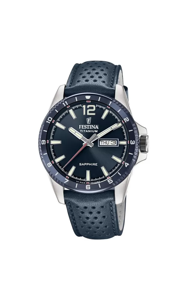 Nový model pánský hodinek Festina potěší především alergiky na obecné kovy. Pouzdro hodinek je vyrobeno z titanu, který má výjimečné vlastnosti a jedna z nich je lehkost, odolnost a také to, že je antialergický. Pouzdro hodinek zdobí výrazná luneta. Další předností tohoto modelu jsou indexy hodin potažené luminiscenční vrstvou. Na hodinky tedy po nasvícení uvidíte i ve tmě. Nemůže chybět datumovka, která je umístěna na pozici tří hodin. Ciferník chrání safírové sklo, které jak je známo disponuje velkou odolností. Celý tento model podtrhuje kožený řemínek, který už na první pohled slibuje maximální komfort.