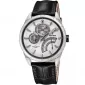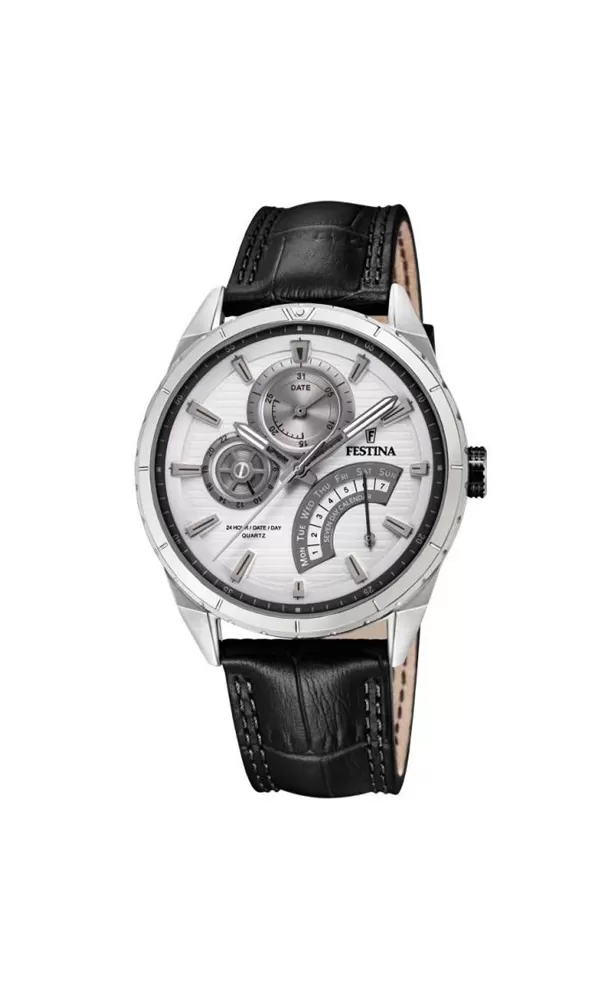 Pánské sportovní hodinky Festina - SPORT 16986/1 s ocelovým pouzdrem a s černým koženým řemínkem. Zapínání řemínku je klasické na přezku. Na stříbrném ciferníku figurují tři subciferníky, které znázorňují ukazatele data, dne v týdnu a 24 hodin. Hodinky jsou vhodné pro běžné denní nošení i do společnosti.