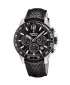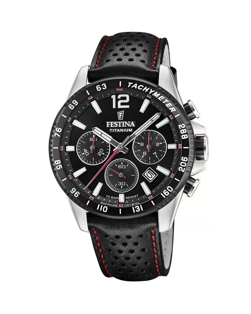 Pánské náramkové hodinky váš potěší tím, že jsou vyrobené z titanu. Potěší to především zákazníky, které trpí alergií na obecné kovy. Hodinky mají klasické kulaté pouzdro zdobené vyladěnou korunkou a tlačítky na ovládání chronografu. Safírové sklo chrání přehledná ciferník, který se může pyšnit jednoduchými indexy hodin, které jsou potaženy luminiscenční vrstvou, díky které uvidíte i v noci kolik je hodin. Na ciferníku najdete i stopky a datum. Celý tento model doplňuje kožený řemínek.