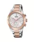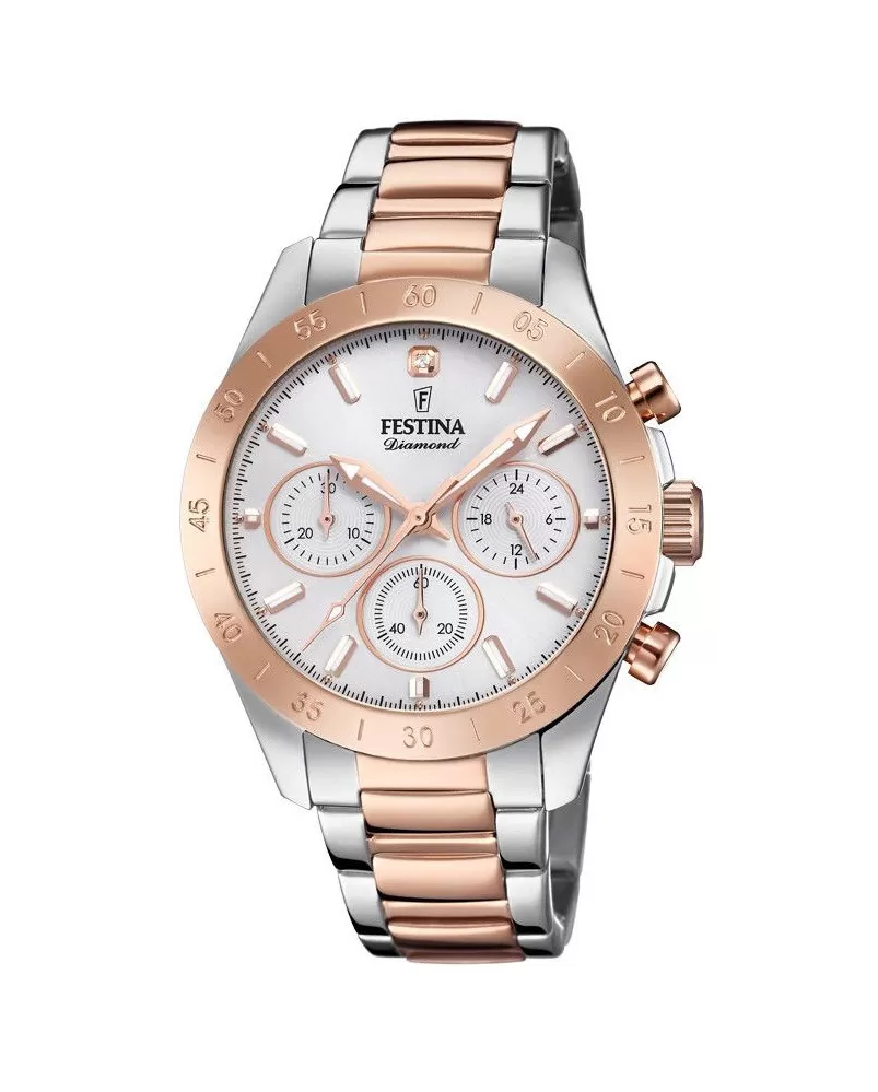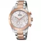 Dámské náramkové hodinky vyrobené z nerezové oceli v kombinaci ocelové a růžové barvy zlata s bílým ciferníkem můžete nosit jak v běžný den, tak do společnosti. Bílý ciferník je zdobený třemi sub-ciferníky s funkcí stopek a 24 hodinovým formátem času. Hodinky jsou pod označením 50M vodotěsné až do hloubky 0,5 metrů.