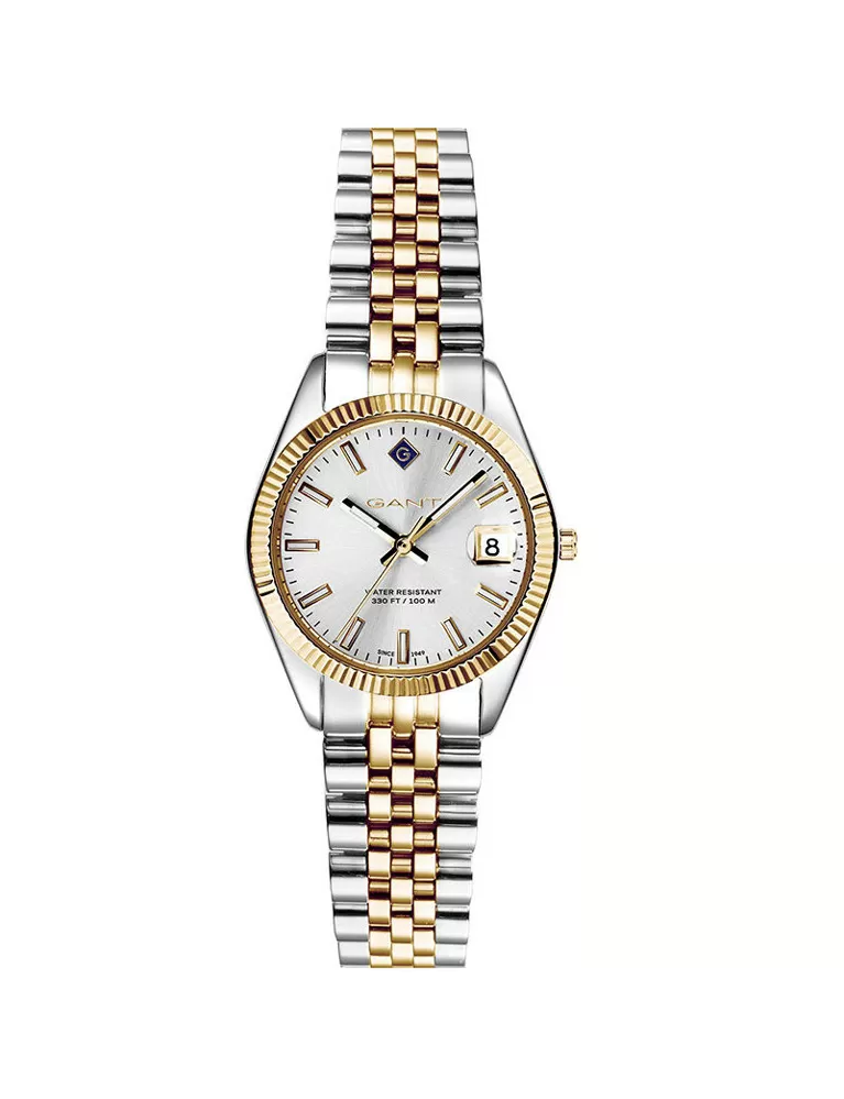 Decentní dámské náramkové hodinky Gant jsou navrženy tak, aby skvěle padly ženskému zápěstí. Hodinky jsou vyrobeny z vysoce kvalitní nerezové ocele. Ocel je místy ošetřena PVD povrchovou úpravou v barvě žlutého zlata. Kulaté pouzdro je vybaveno spolehlivým strojkem a baterií s dvouletou životností. Stříbrný číselník má k dispozici jednoduché ručičky a indexy hodin. Na pozici třetí hodiny najdete datum. Hodinky jsou vhodné pro každodenní nošení i do společnosti.