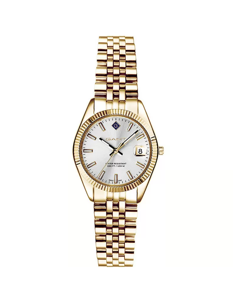 Decentní dámské náramkové hodinky Gant jsou navrženy tak, aby skvěle padly ženskému zápěstí. Hodinky jsou vyrobeny z vysoce kvalitní nerezové ocele. Ocel je ošetřena PVD povrchovou úpravou v barvě žlutého zlata. Kulaté pouzdro je vybaveno spolehlivým strojkem a baterií s dvouletou životností. Stříbrný číselník má k dispozici jednoduché ručičky a indexy hodin. Na pozici třetí hodiny najdete datum. Hodinky jsou vhodné pro každodenní nošení i do společnosti.