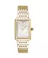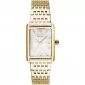 Ozdobte své zápěstí tímto modelem. Hodinky jsou vyrobeny z vysoce kvalitní nerezové ocele. Ocel je ošetřena PVD povrchovou úpravou v barvě žlutého zlata. Hranaté pouzdro je vybaveno spolehlivým strojkem a baterií s dvouletou životností. Model doplňuje bílý strukturovaný číselník s jednoduchými ručičkami a indexy hodin.