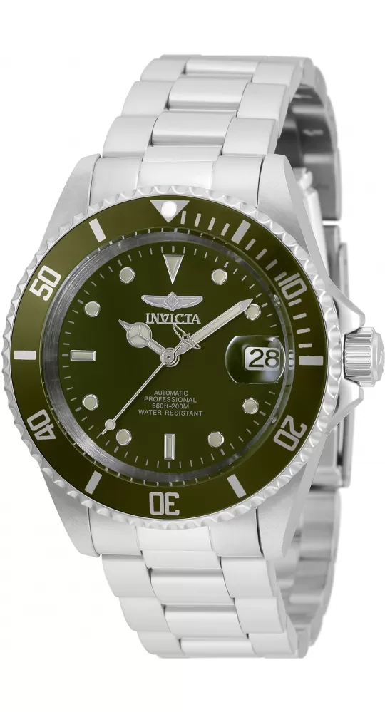 Invicta Pro Diver Automatic 35690 jsou pánské automatické hodinky z oblíbené řady Invicta Pro Diver, které kombinují sportovní charakter s klasickým designem vhodným pro každodenní nošení i volnočasové aktivity. Tento model má pouzdro z nerezové oceli o průměru 40 mm a robustní ocelový tah se skládací sponou, což zajišťuje pohodlné a pevné nošení na zápěstí.