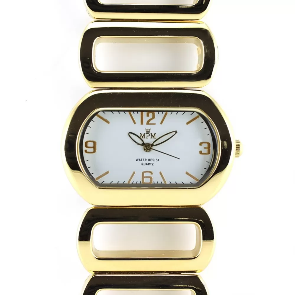 Náramkové hodinky oválného tvaru s bílým číselníkem.