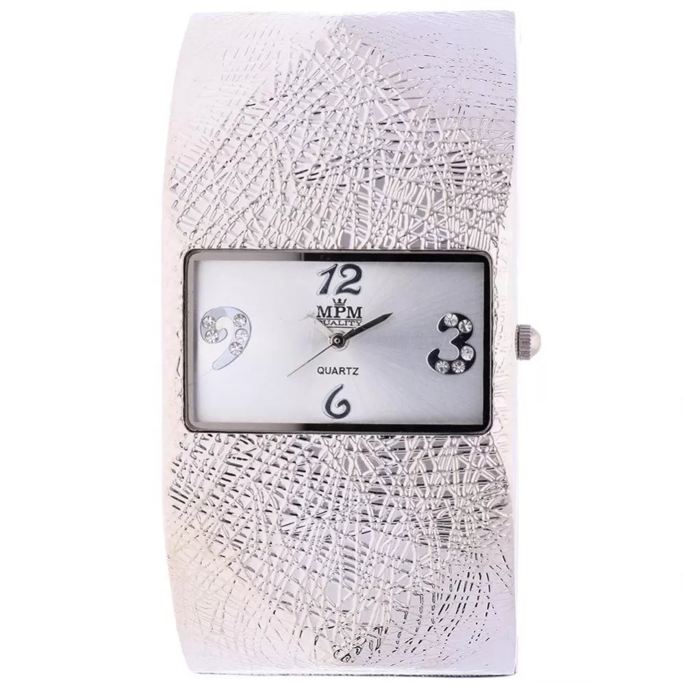 Dámské hodinky MPM s netradičním hranatým ciferníkem. Část číslic na hodinkách je osazena stylovými kamínky. Společně se zdobným slitinovým náramkem dotvářejí celkovou eleganci nositelky.