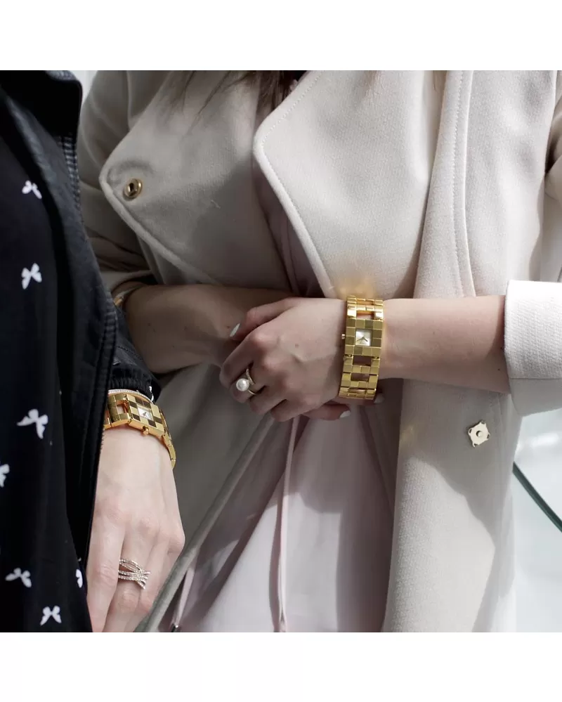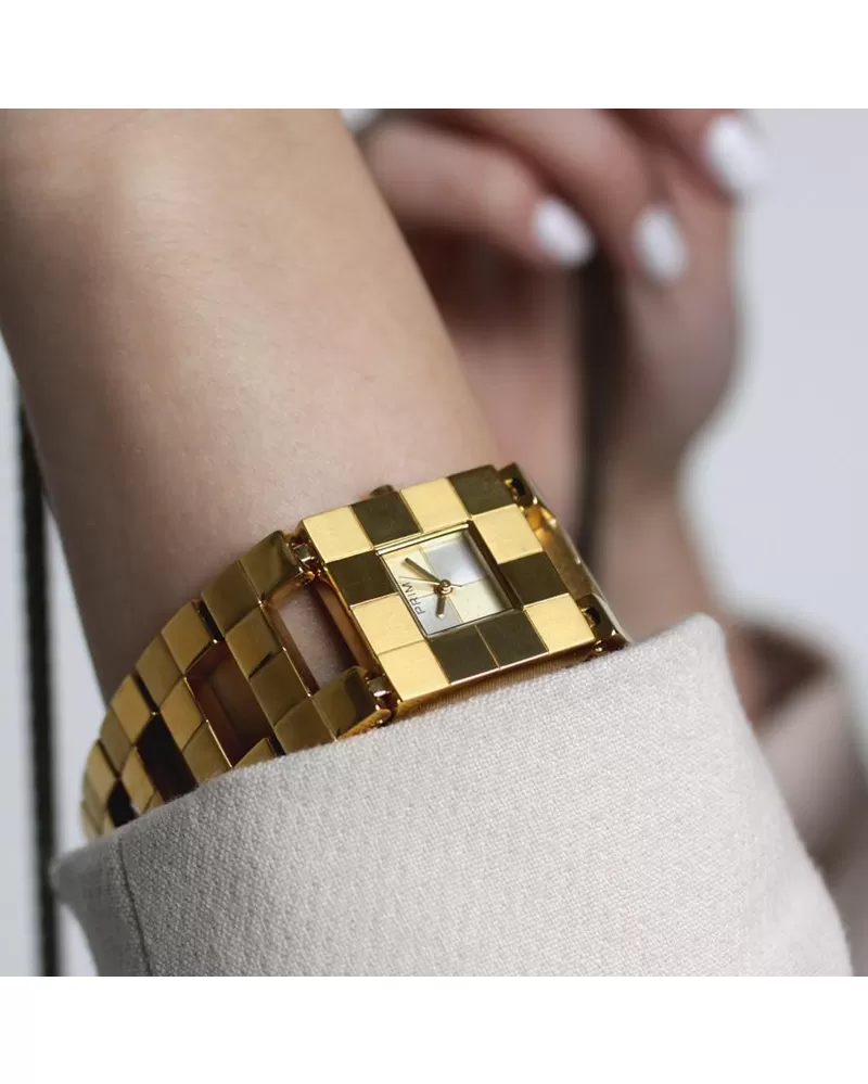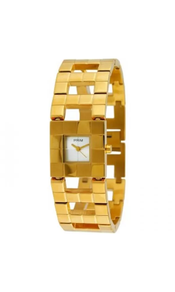 Nepřehlednutelné dámské náramkové hodinky značky Prim si zamilují ženy, které si potrpí na jedinečné a stylové doplňky.Hodinky mají výrazný řemínek, který je vyrobený z ušlechtilé nerezové oceli, která je upravena technologiíí IPG, která dodává hodinkám zlatý odstín. Ciferník je drobný, hranatého tvaru a chráněný je minerálním sklem.