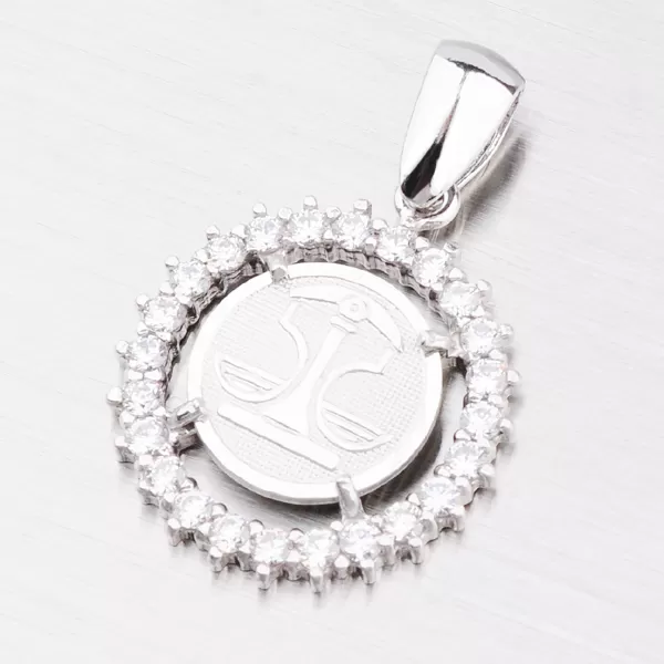 Tento nádherný přívěsek kulatého tvaru s motivem znamení zvěrokruhu - Váhy (23.9.-23.10) je vyroben ze stříbra ryzosti 925/1000 v kombinaci lesklé a matné povrchové úpravy s rhodiováním. Dokola je osázený třptivými zirkony, které přívěsek rozzáří. K přívěsku je vhodné použít řetízek o max. průměru 3 mm.