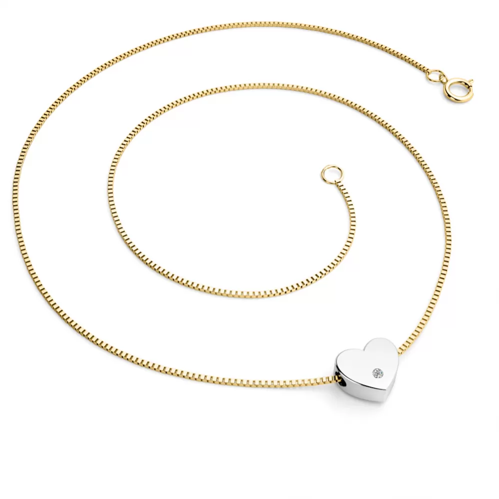 Elegantní náhrdelník je vyrobený ze čtrnáctikarátového zlata - 585/1000 a tvoří ho Benátský řetízek - kostičky ze žlutého zlata a srdíčko z bílého zlata, které po řetízku jezdí - je "na volno". V srdíčku je vsazen jeden kulatý diamant, vybroušený briliantovým brusem. Briliantový brus zajišťuje diamantu maximální brilanci vybroušených facet, dokonale odráží světlo a krásně září z každého úhlu pohledu! Vsazování diamantů provádějí naši nejzkušenější mistři zlatníci ručně pod mikroskopem s přesností na 0,01mm a proto nehrozí vypadnutí kamínků jako to bývá u strojně vyráběných šperků. Celý náhrdelník působí jemným a elegantním dojmem.