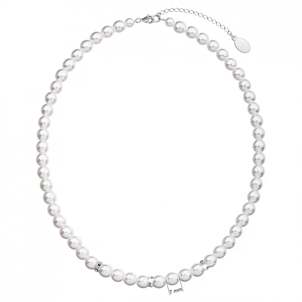 Perlový náhrdelník 32012.1 v délce 45 cm je složen z bílých perel, mezi něž jsou navléknuty tři rhuteniové rondelky osázené Swarovski krystalky. Krystaly jsou v bílé barvě. Na zapínání náhrdelníku bylo použito stříbro ryzosti 925/1000, které prošlo úpravou rhodiem. Rhodium stříbro ochrání proti zčernání, zežloutnutí i poškrábání. Náhrdelník je vhodný i pro alergiky, neobsahuje totiž nikl.