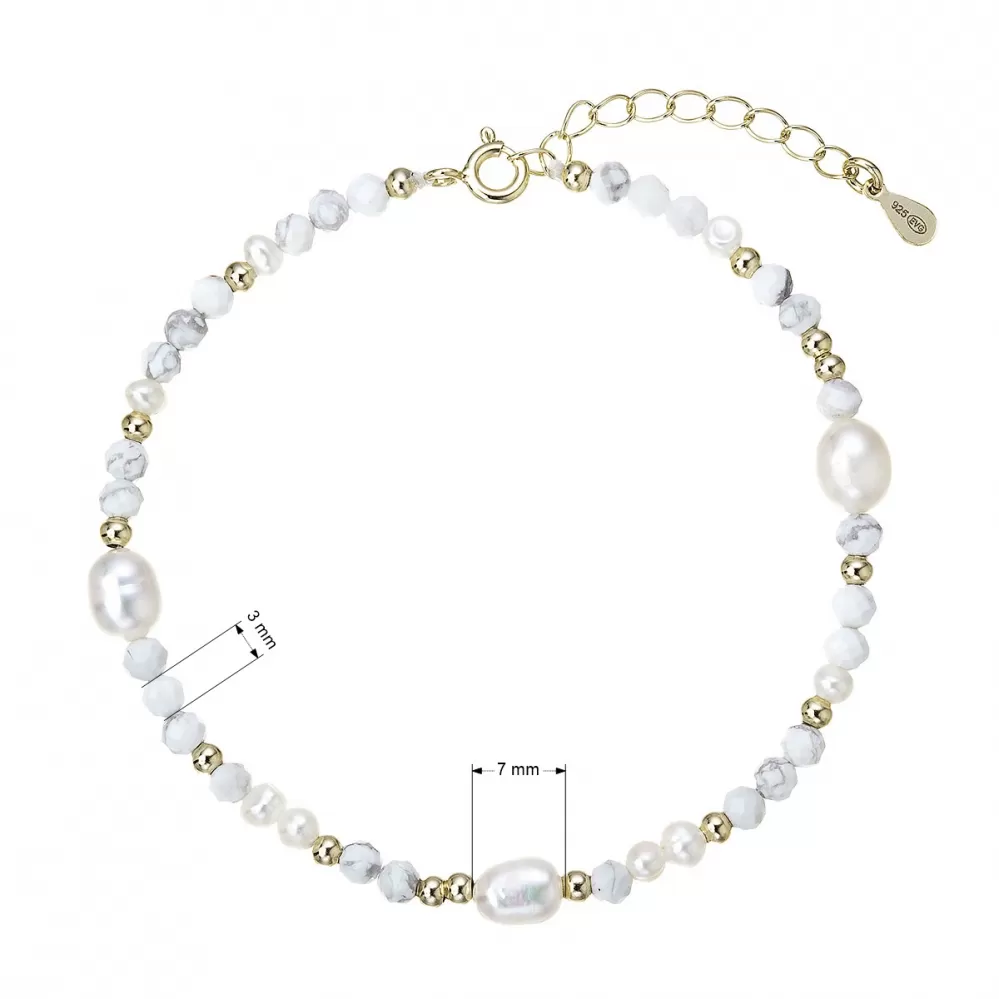 Tento elegantní náramek je tvořen kombinací pravých howlitů bílé barvy a pravých říčních perel různých tvarů, které dohromady vytvářejí harmonický a ženský celek. Drobné broušené howlity se krásně lesknou a dokonale ladí s přirozeným perleťovým třpytem perel.