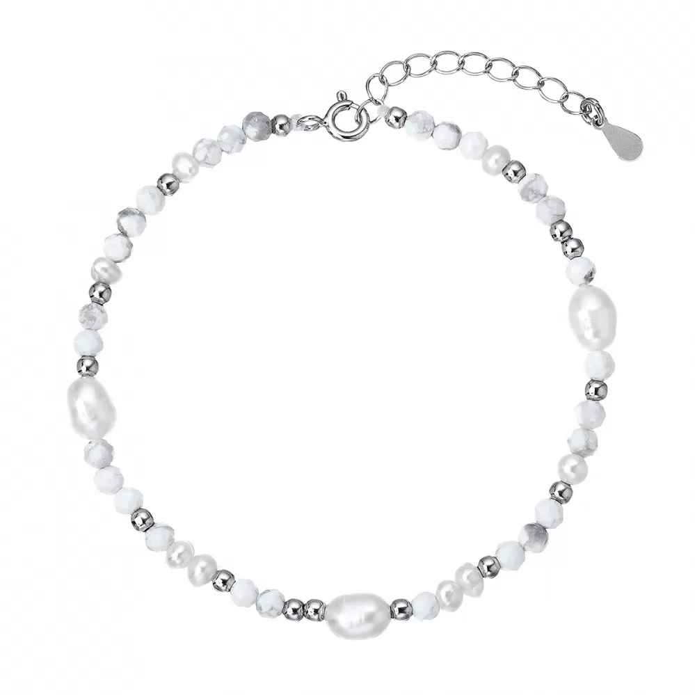 Tento elegantní náramek je tvořen kombinací pravých howlitů bílé barvy a pravých říčních perel různých tvarů, které dohromady vytvářejí harmonický a ženský celek. Drobné broušené howlity se krásně lesknou a dokonale ladí s přirozeným perleťovým třpytem perel.