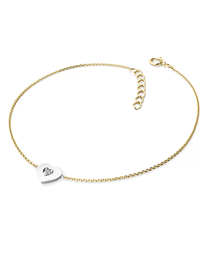 Chcete Vaši milé či blízké osobě udělat radost s něčím, co nikdo jiný nemá? Kupte jí tento náramek ze žlutého a bílého čtrnáctikarátového zlata 585/1000 s diamantem! Náramek tvoří řetízek typu anker s lesklými facetami na každém očku a se srdíčkem uprostřed. Srdce je symbolem lásky, takže pokud chcete svou milou zaujmout a vyznat jí lásku, nebo své blízké osobě ukázat, jak ji máte rádi a záleží vám na ni, tento náramek je přesně to, co hledáte! V srdíčku je vsazen jeden kulatý diamant, vybroušený kulatým briliantovým brusem, který zajišťuje maximální brilanci vybroušených facet ze všech úhlů pohledu! Vsazování diamantů provádějí naši nejzkušenější mistři zlatníci ručně pod mikroskopem s přesností na 0,01mm a proto nehrozí vypadnutí diamantů jako to bývá u strojně vyráběných šperků.