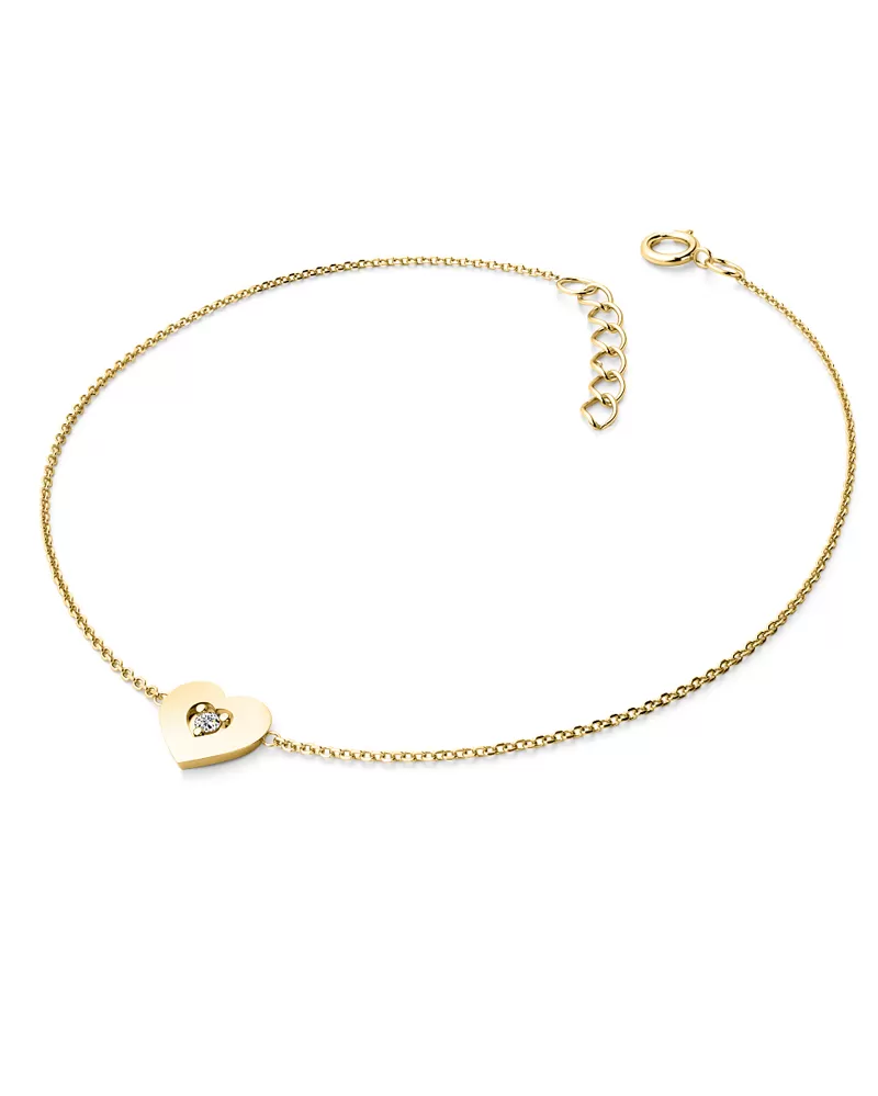 Chcete Vaši milé či blízké osobě udělat radost s něčím, co nikdo jiný nemá? Kupte jí tento náramek ze žlutého čtrnáctikarátového zlata 585/1000 s diamantem! Náramek tvoří řetízek typu anker s lesklými facetami na každém očku a se srdíčkem uprostřed. Srdce je symbolem lásky, takže pokud chcete svou milou zaujmout a vyznat jí lásku, nebo své blízké osobě ukázat, jak ji máte rádi a záleží vám na ni, tento náramek je přesně to, co hledáte! V srdíčku je vsazen jeden kulatý diamant, vybroušený kulatým briliantovým brusem, který zajišťuje maximální brilanci vybroušených facet ze všech úhlů pohledu! Vsazování diamantů provádějí naši nejzkušenější mistři zlatníci ručně pod mikroskopem s přesností na 0,01mm a proto nehrozí vypadnutí diamantů jako to bývá u strojně vyráběných šperků.