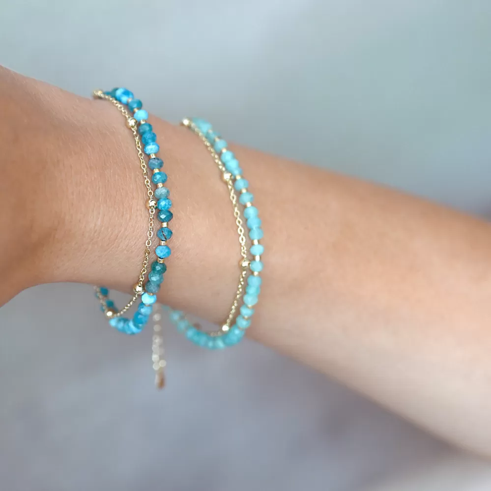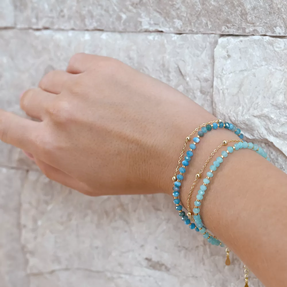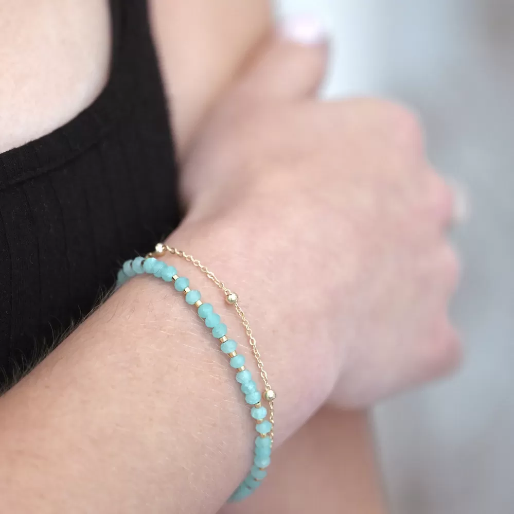 Tento rafinovaný dvojitý náramek kombinuje zlatavý řetízek z pozlaceného stříbra s korálky z pravých amazonitů v jemně tyrkysové barvě. Kontrast teplého zlata a chladivých tónů minerálu vytváří moderní, harmonický a velmi svěží design.