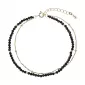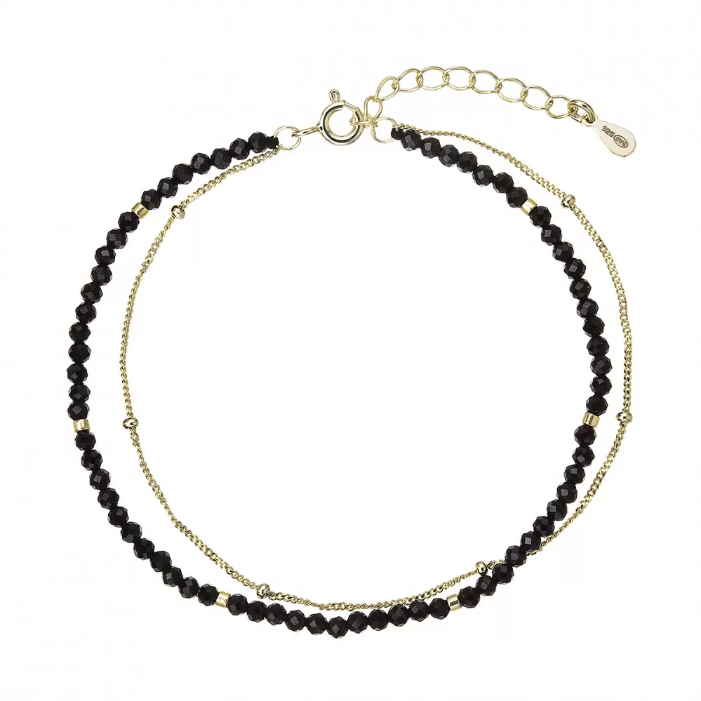 Tento působivý dvojitý náramek kombinuje jemný pozlacený stříbrný řetízek s linií drobných fasetovaných černých spinelů. Temné, výrazně se lesknoucí minerály vytvářejí nádherný kontrast k teplému zlatému odstínu kovu a dodávají šperku luxusní, moderní a výrazný charakter.