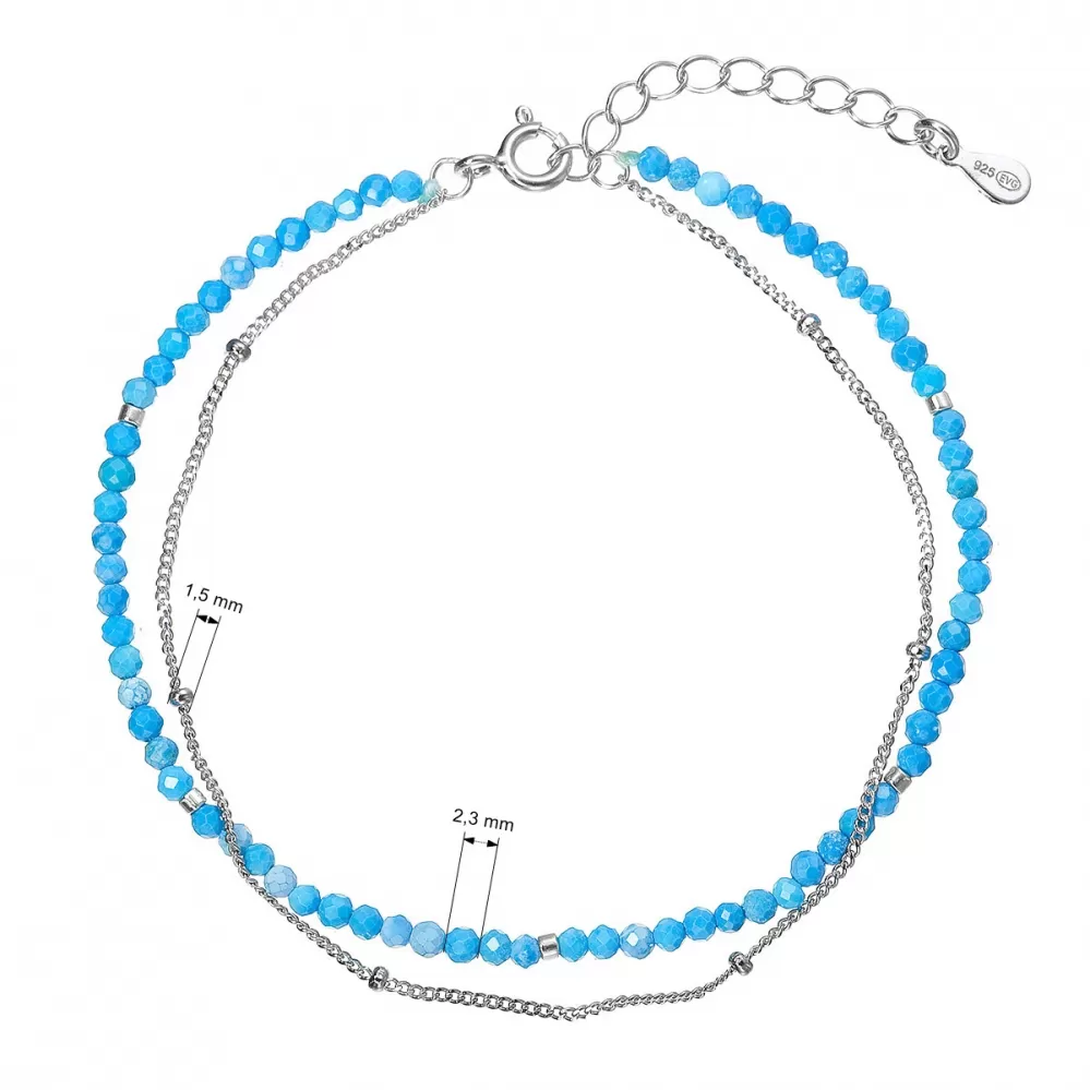 Tento elegantní dvojitý náramek kombinuje jemný stříbrný řetízek a linii drobných broušených korálků z pravého howlitu barveného do výrazné modré… Celý popis