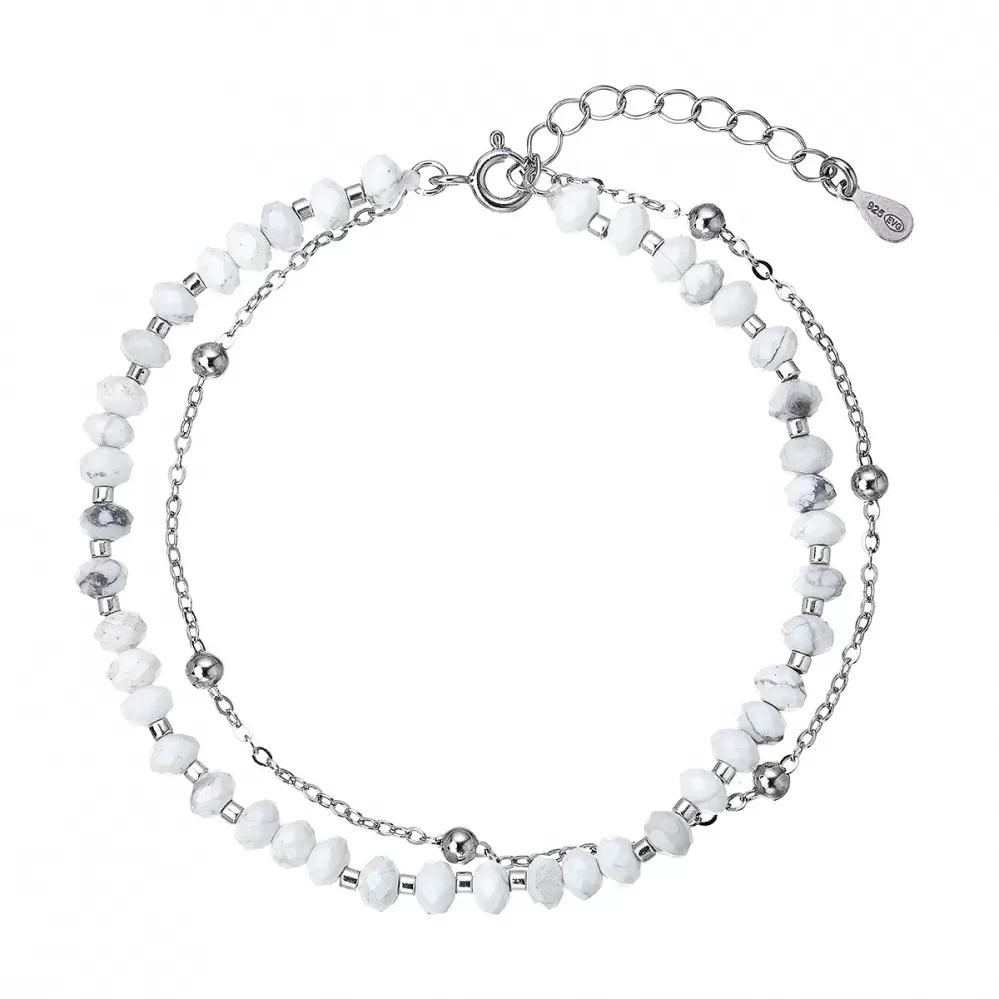 tento jemný dvojitý náhrdelník spojuje elegantní rhodiovaný stříbrný řetízek s linií korálků z pravých bílých howlitů s jemným šedým žilkováním. Howlit je ceněný pro svůj klidný, harmonický vzhled, který šperku dodává nadčasovou eleganci a lehkost. Stříbro ryzosti 925/1000 zajišťuje přirozený lesk, odolnost a dlouhou životnost. Díky karabince a prodlužovacímu řetízku lze náhrdelník pohodlně upravit z délky 17 cm o další 4 cm.
