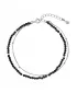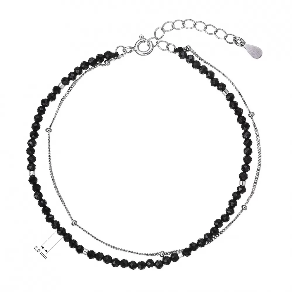 Tento elegantní dvojitý náramek propojuje jemný rhodiovaný stříbrný řetízek s linií drobných fasetovaných černých spinelů. Lesklé minerály vynikají výrazným kontrastem ke studenému tónu rhodiovaného stříbra a dodávají šperku moderní, sofistikovaný a lehce tajemný vzhled.