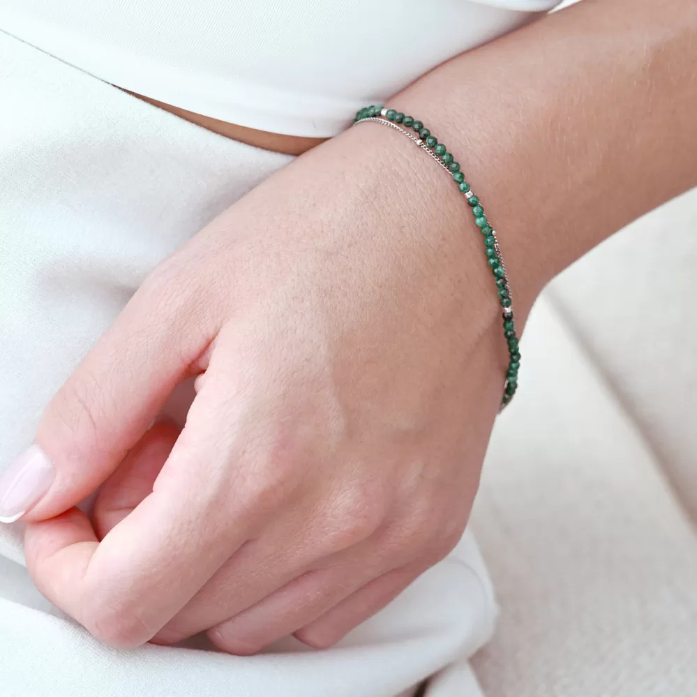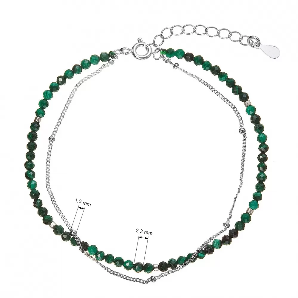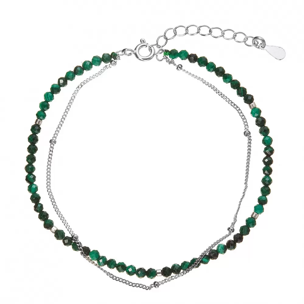Tento elegantní dvojitý náramek kombinuje jemný stříbrný řetízek s linií drobných broušených korálků ze zeleného malachitu. Sytě zelené tóny malachitu krásně vynikají vedle chladivého lesku stříbra. Náramek je vyroben ze stříbra ryzosti 925/1000 s rhodiovou povrchovou úpravou, která zajišťuje dlouhotrvající lesk a ochranu proti zčernání. Díky zapínání na karabinku a adjustě lze jeho délku upravit z 17 cm o další 4 cm. Jemný, moderní a přitom výrazný šperk pro každý den.