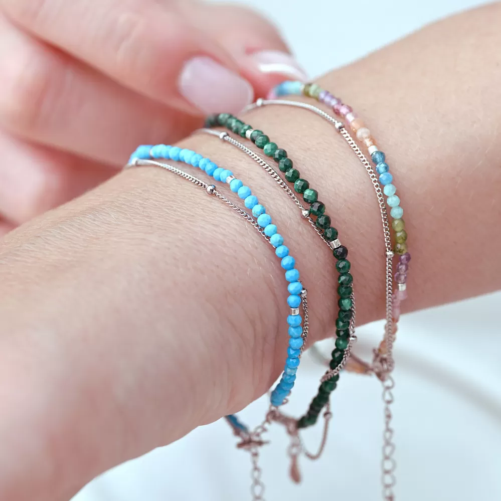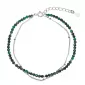 Tento elegantní dvojitý náramek kombinuje jemný stříbrný řetízek s linií drobných broušených korálků ze zeleného malachitu. Sytě zelené tóny… Celý popis