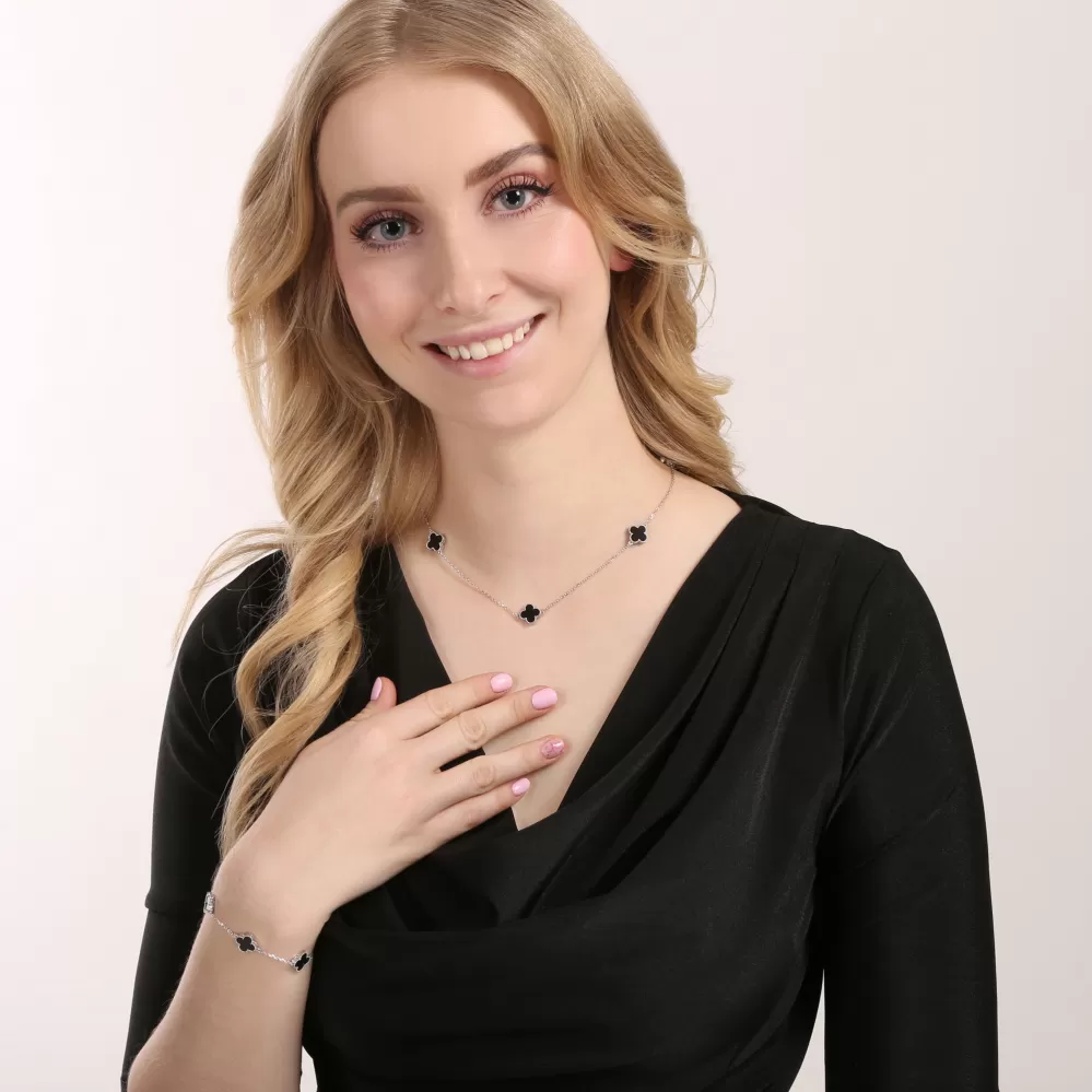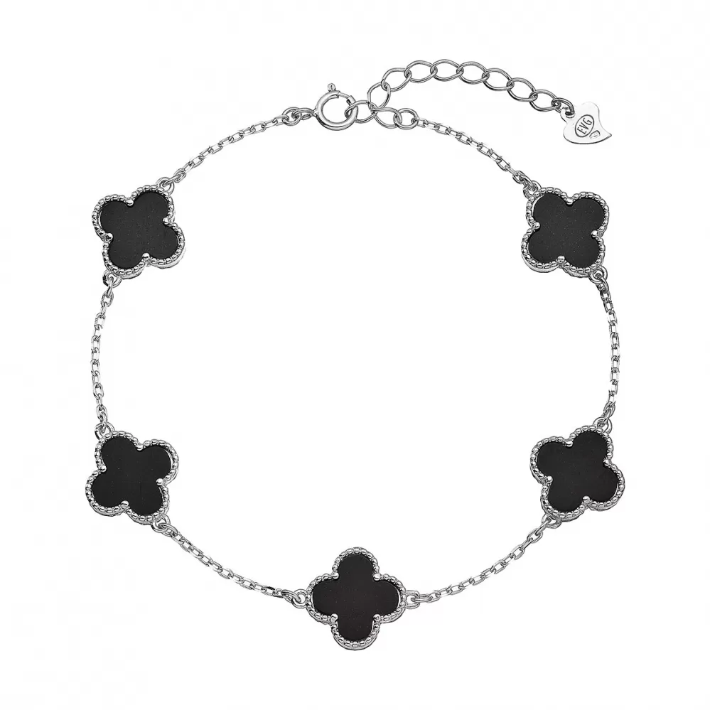 Jemný stříbrný náramek s půvabnými čtyřlístky je symbolem štěstí a nadčasové elegance. Každý čtyřlístek je vyplněn černým pinolitem, který dodává šperku jedinečný a tajemný charakter.