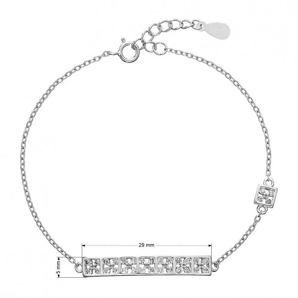Náramek 13014.1 vyrábíme ze stříbra ryzosti 925/1000, jehož povrch ošetřujeme rhodiem. Rhodium šperk ochrání proti zčernání, zežloutnutí i poškrábání. Náramek zdobí jemný řetízek, jeden čtverec se zirkony a také rovná čára, kterou tvoří 7 okének se zirkony.