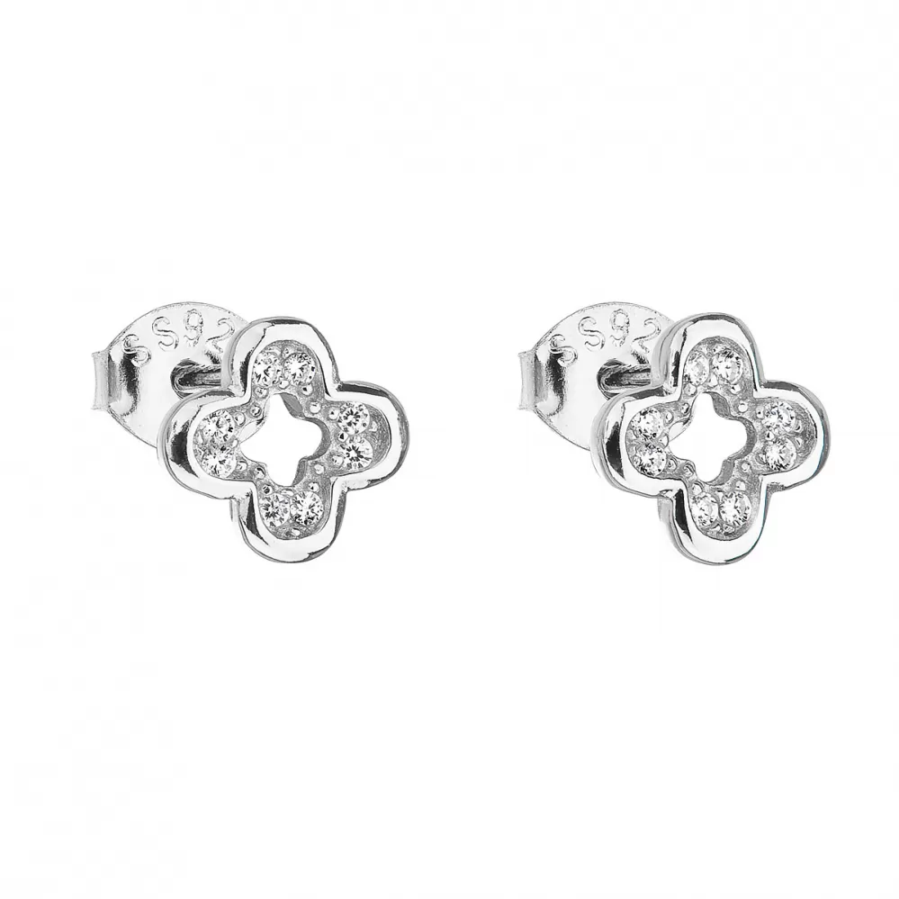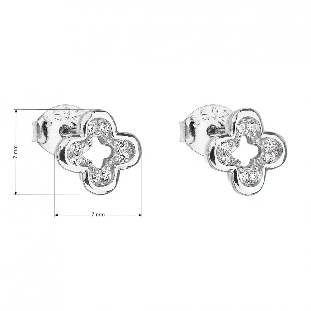 Náušnice zdobí čiré zirkony poskládané do tvaru čtyřlístku, který je lemován stříbrným rámečkem. Náušnice zapnete na puzetu.