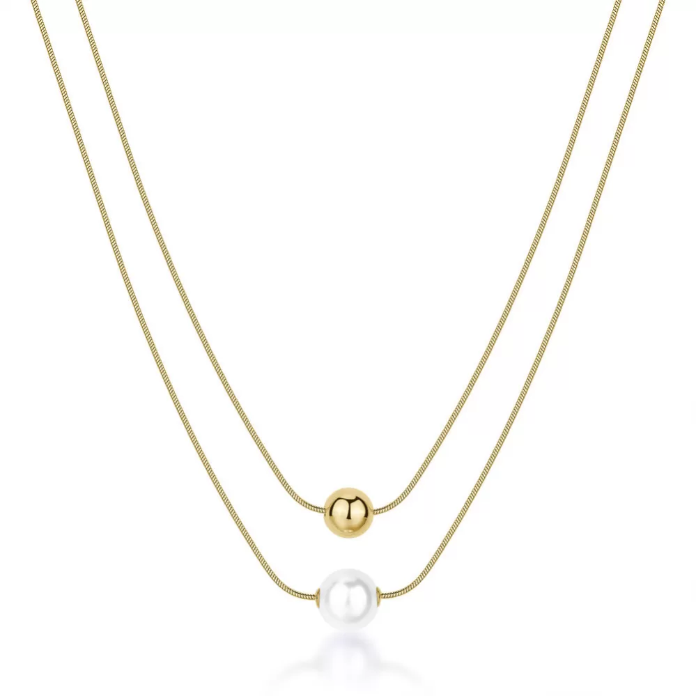 Tento náhrdelník je vyroben z kvalitní chirurgické oceli, která je hypoalergenní a odolná vůči opotřebení. Povrch náhrdelníku je ošetřen zlatým povlakem PVD, který mu dodává teplý odstín a lesk. Design náhrdelníku tvoří dvouvrstvý styl, na kterém visí kulatý přívěsek a syntetická perla. Celková délka náhrdelníku je 48 cm. Zapínání je řešeno pomocí karabiny, což zajišťuje bezpečné a pohodlné nasazení. Tento model náhrdelníku je vhodný pro každodenní nošení i pro slavnostní příležitosti. Působí elegantně, ale ne okázale.