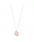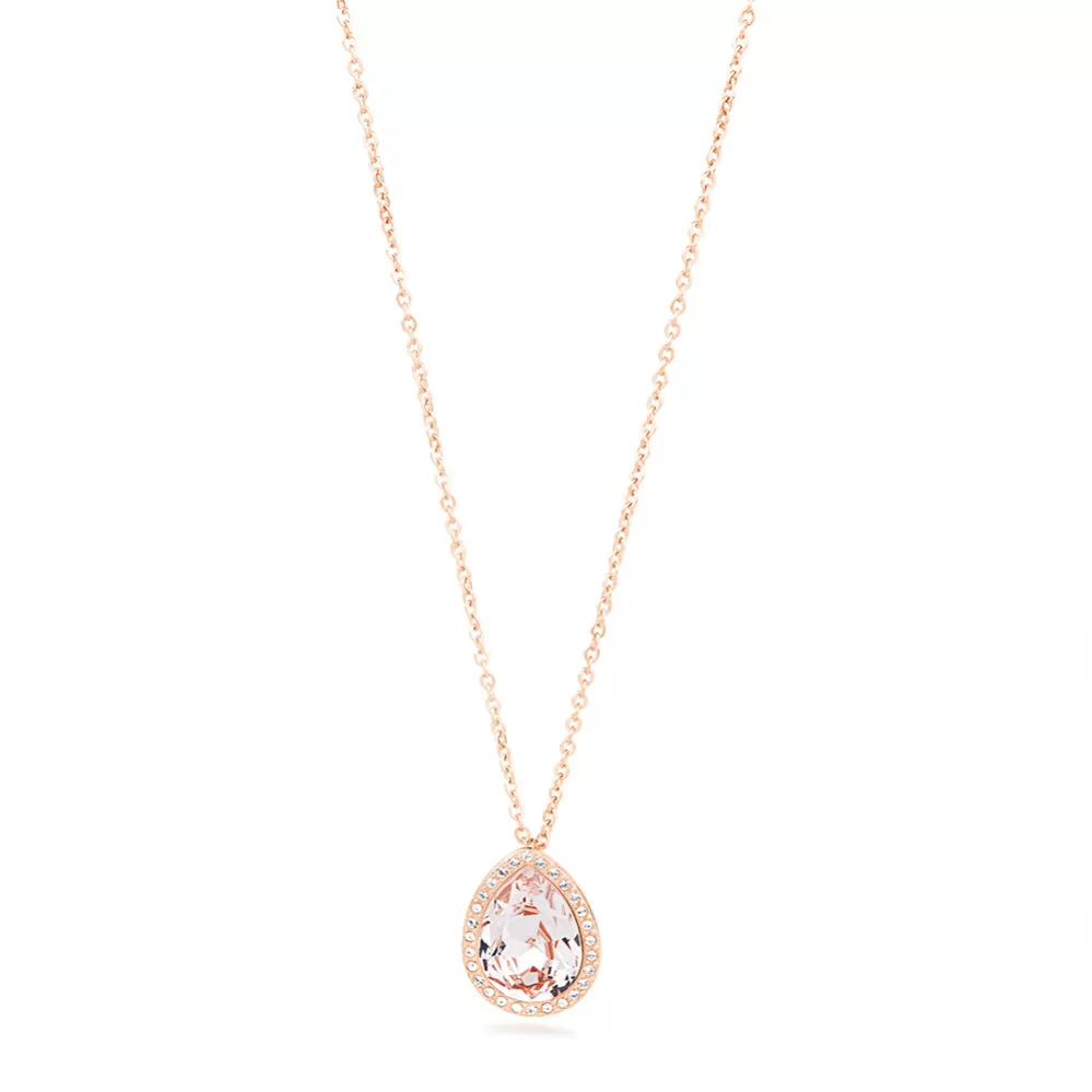 Skvostný náhrdelník je vyroben z kvalitní nerezové ocele. Ocel je ošetřena PVD povrchovou úpravou v barvě růžového zlata. Náhrdelník je složen z pevného řetízku, na kterém je zavěšen nepřehlédnutelný přívěsek. Přívěsek ve tvaru kapky je precizně osázen krystaly Swarovki v bílé barvě. Tyto čiré krystaly Swarovski obklopují velký čirý krystal Swaroovski, který je pečlivě broušen tak, aby dokonale odrážel světlo.