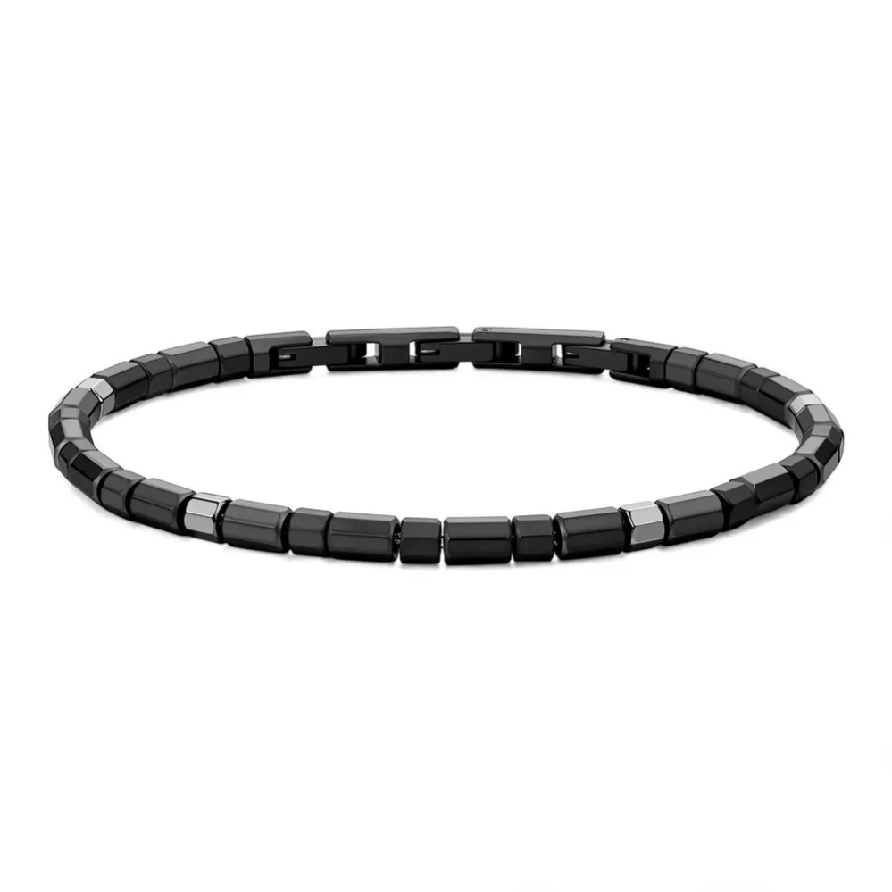 Tento stylový náramek spojuje moderní design s odolnými materiály. Je vyroben z chirurgické oceli, která je známá svou pevností, dlouho životností a odolností vůči korozi. Povrch náramku je opatřen černým PVD povlakem, který mu dodává elegantní, matně lesklý vzhled a zvyšuje jeho odolnost proti poškrábání. Díky své délce 22 cm se pohodlně nosí na širším zápěstí. Design náramku je minimalistický a působí velmi mužně, bez zbytečného zdobení, s důrazem na čisté linie a kvalitu zpracování.