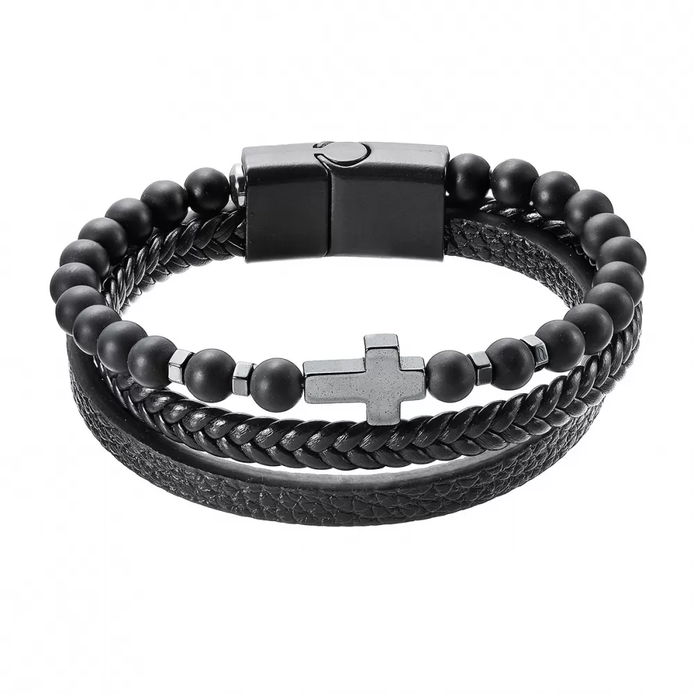 Tento elegantní náramek kombinuje koženku a matné černé korálky, což vytváří stylový doplněk pro každého muže. Černá barva a hematitový kříž dodávají náramku nadčasový vzhled.