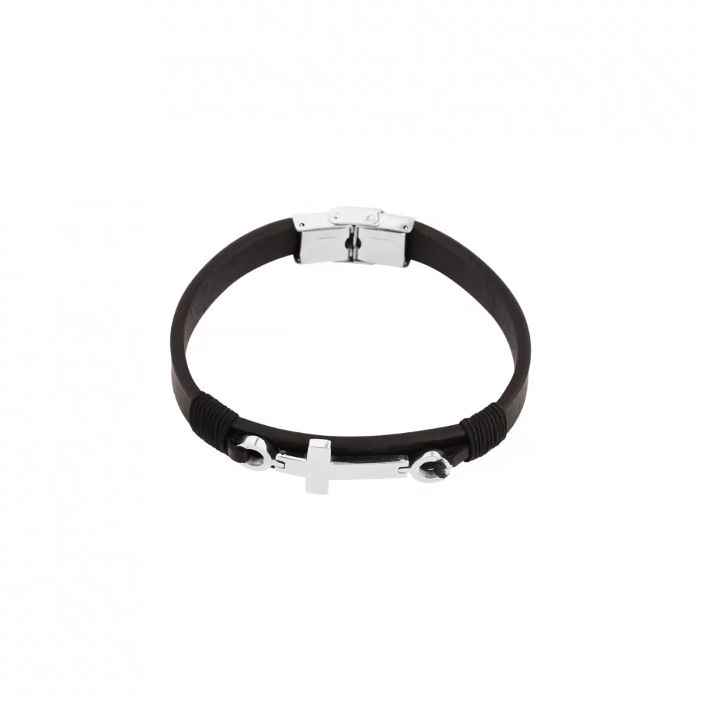Pánský náramek je vyrobený z černé recyklované kůže a ozdobený ocelovým křížem.
