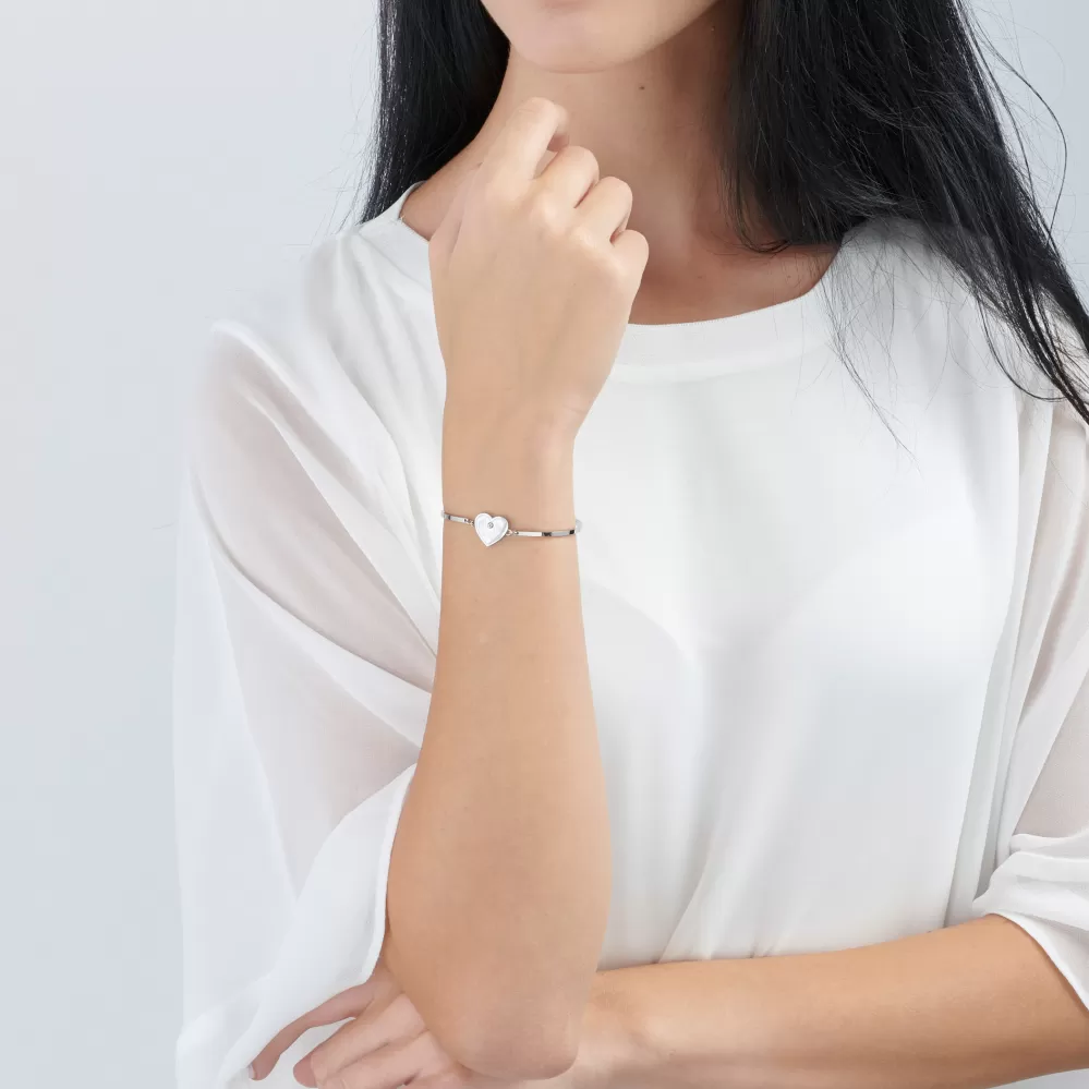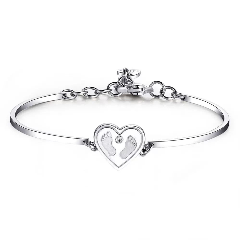 Dámský náramek je vyroben z vysoce kvalitní oceli, která je leštěná do vysokého lesku. Náramek zdobí srdce na kterém jsou vyobrazeny nožičky. Délka náramku je 15 cm, s využitím řetízku 3 cm, je možné náramek zapnout v délce 15 až 18 cm. Nastavitelná délka má užasnou výhodu v tom, že nemusíte znát přesnou délku náramku a obdarovaná osoba si délku sama upraví podle vlastních preferencí. Náramek se zapíná na spolehlivou karabinu.