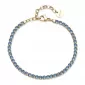 Tento náramek je luxusní doplněk, který spojuje moderní design s jemným leskem kubických zirkonů. Je vyroben z kvalitní nerezové oceli, která zaručuje vysokou odolnost a dlouhotrvající lesk. Ocel je opatřena PVD povrchovou úpravou v barvě žlutého zlata. Dominantním prvkem jsou precizně broušené kubické zirkony v modré barvě, které při dopadu světla vytvářejí jemnou hru odlesků a dodávají šperku sofistikovaný nádech. Každý zirkon je pečlivě vsazen do ocelového lůžka, což zaručuje bezpečné uchycení i pro dlouhodobém nošení. Tento model je ideální pro ženy, které milují šperky s třpytem, ale zároveň si potrpí na decentní a vkusný styl.