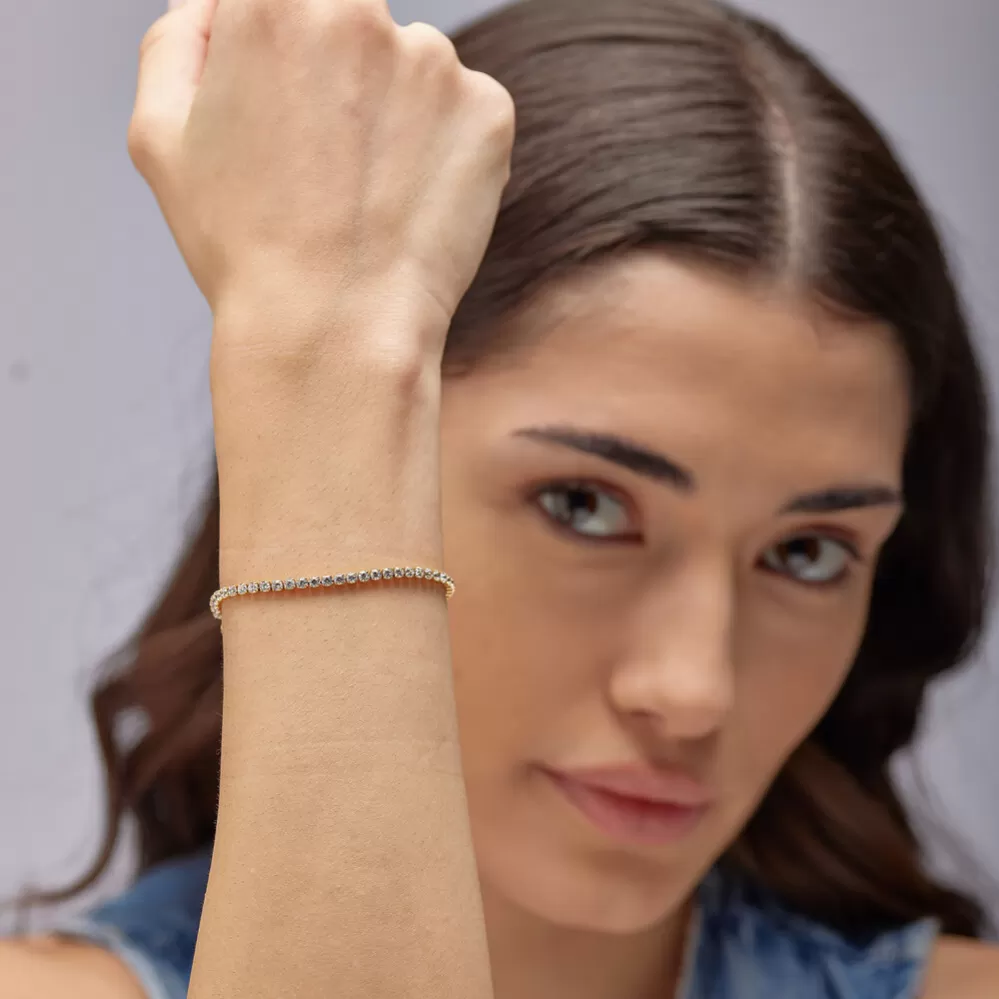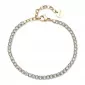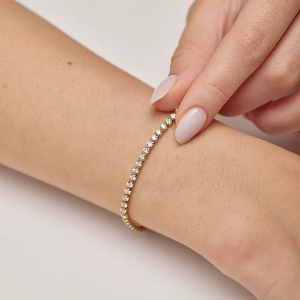 Tento náramek je luxusní doplněk, který spojuje moderní design s jemným leskem kubických zirkonů. Je vyroben z kvalitní nerezové oceli, která zaručuje vysokou odolnost a dlouhotrvající lesk. Ocel je opatřena PVD povrchovou úpravou v barvě žlutého zlata. Dominantním prvkem jsou precizně broušené kubické zirkony v bílé barvě, které při dopadu světla vytvářejí jemnou hru odlesků a dodávají šperku sofistikovaný nádech. Každý zirkon je pečlivě vsazen do ocelového lůžka, což zaručuje bezpečné uchycení i pro dlouhodobém nošení. Tento model je ideální pro ženy, které milují šperky s třpytem, ale zároveň si potrpí na decentní a vkusný styl.