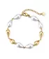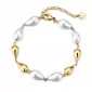 Tento náramek je vyroben z kvalitní chirurgické oceli, která je odolná, má stálou barvu a je vhodná i pro citlivou pokožku. Povrch je zdoben zlatým PVD povlakem, což přidává šperku sofistikovaný zlatý odstín. Design náramku je zdoben ozdobnými kapkami v zlaté barvě a prvky s imitací perly, které dodávají decentní kontrast a jemnost. Délka náramku je 19 cm, což je činí vhodným pro většinu zápěstí.