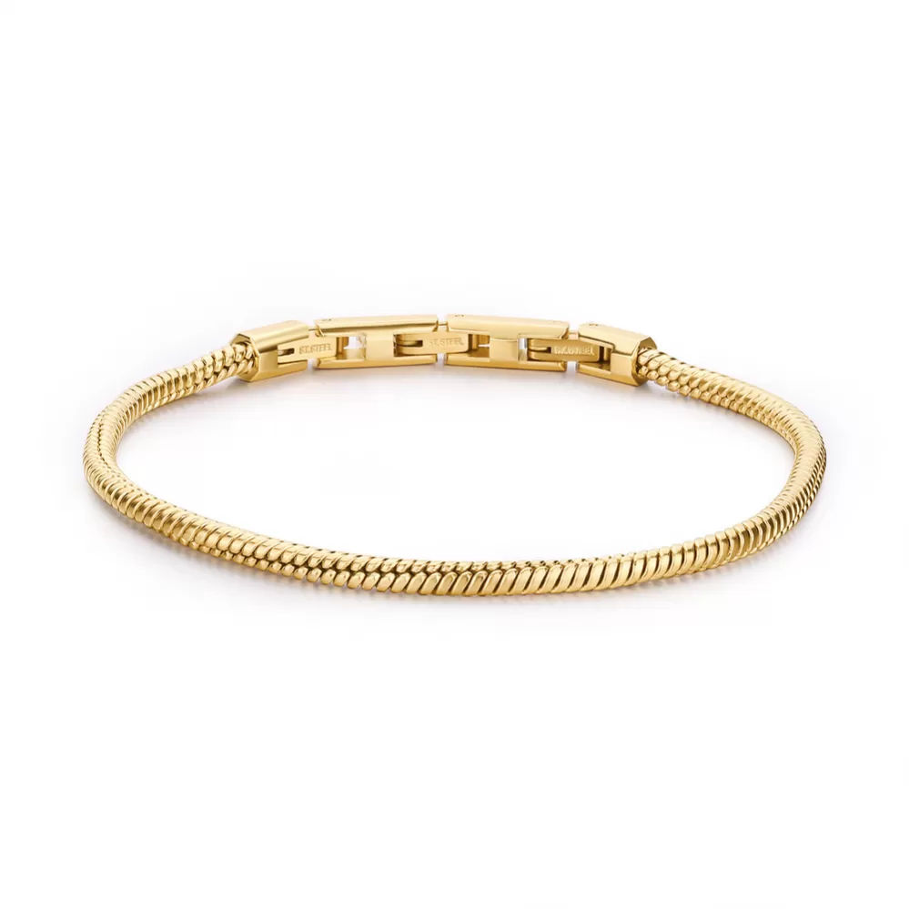 Dámský náramek je vyroben z vysoce kvalitní nerezové ocele, která je ošetřena PVD povrchovou úpravou v barvě žlutého zlata. Náramek je navržen tak, aby dokonale přilnul k Vašemu zápěstí a cítila jste se příjemně.
