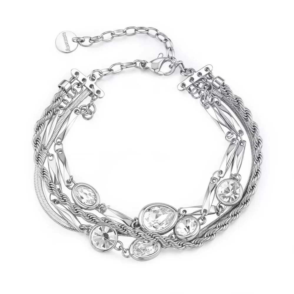 Víceřadový velmi výrazná náramek pro ženy je vyroben z vysoce kvalitní nerezové oceli. Náramek je tvořen řetízky různých druhý a zdoben je zářivými Swarovski krystaly. Tento náramek patří mezi masivní šperky, které Vám dokonale zvýrazní zápěstí a dodá sebevědomí. Náramek se zapíná na spolehlivou karabinu, která uchrání náramek před ztrátou.