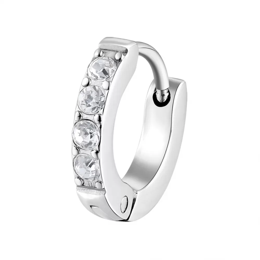 Nový trend mezi náušnicemi jsou náušnice, které se prodávají po jenom kuse. Tento model ve formě kroužku je vyroben z kvalitní ušlechtilé oceli, která je barevně stála a antialergická. Náušnice jsou zdobeny prvotřídními Swarovski krystaly, které jsou precizně vsazeny do oceli.